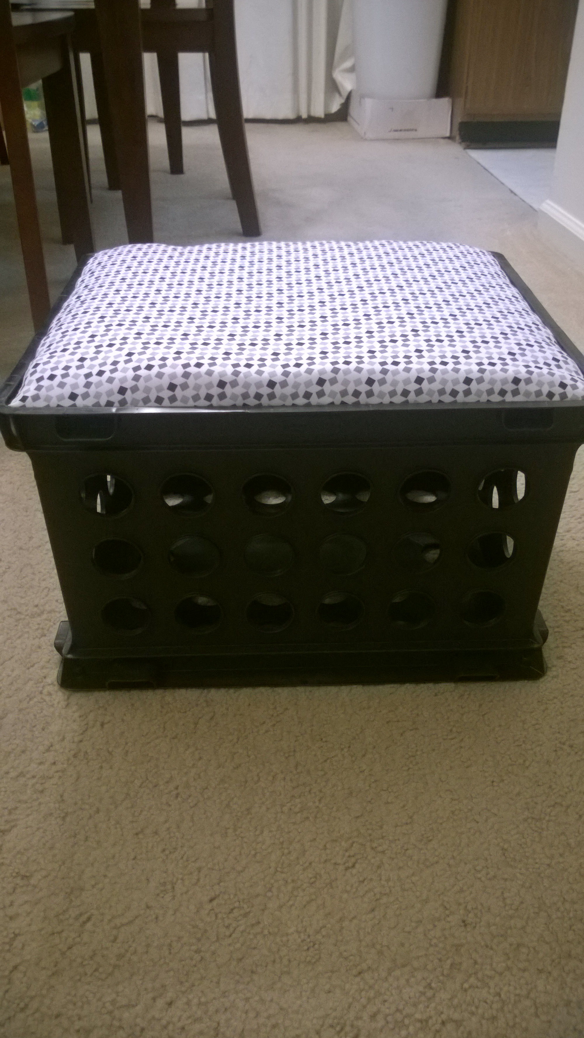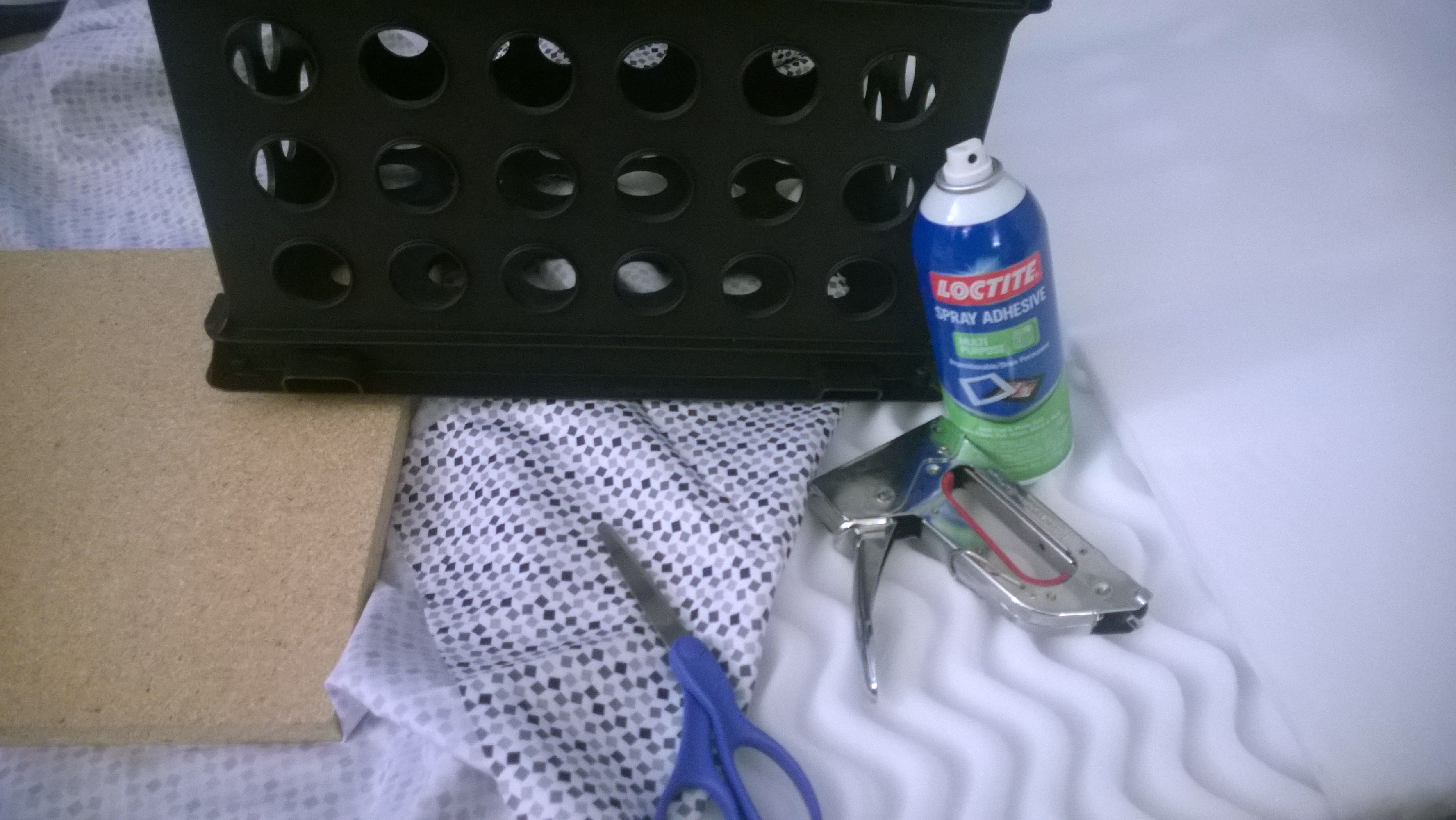 I bought the crate super cheap at WalMart during their back to school sales. I also got the fabric and padding from WalMart. When I compared prices I found that a twin sheet set was actually cheaper than comparable amounts of fabric from the fabric section. I even have some left over for repairs down the road. The particle board I had cut at Home Depot when I bought it. The guy was super helpful when I explained what I wanted done. I even brought in one of the crates and he kept cutting until it fit just right and only charged me for the pieces that worked out. Score one for teachers!